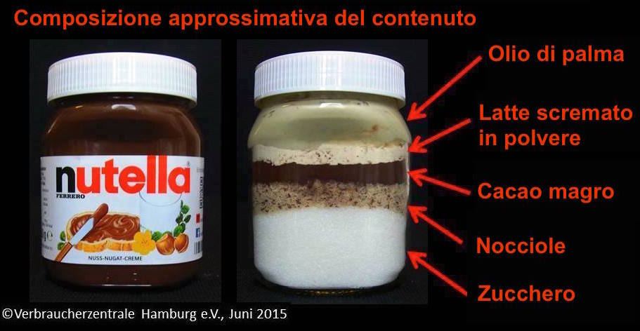 Il Centro tutela consumatori utenti dell’Alto Adige Verbracherzentrale Südtirol evidenzia che 15 dei vasetti esaminati non contengono olio di palma, nove usano miscele di palma e altri grassi mentre solo Nutella e due varietà di Rapunzel contengono solo grasso di palma.