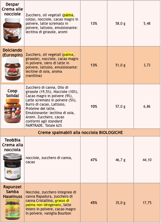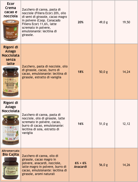 Aggiornamento del 20/06/2018: una versione precedente di questo articolo conteneva un tipo diverso di crema alle nocciole a marchio Ecor, la cui produzione è cessata alla fine di maggio 2018. Nella tabella ora è presente la nuova versione della crema, che rispetto a quella fuori produzione contiene più nocciole e cacao e meno zuccheri.