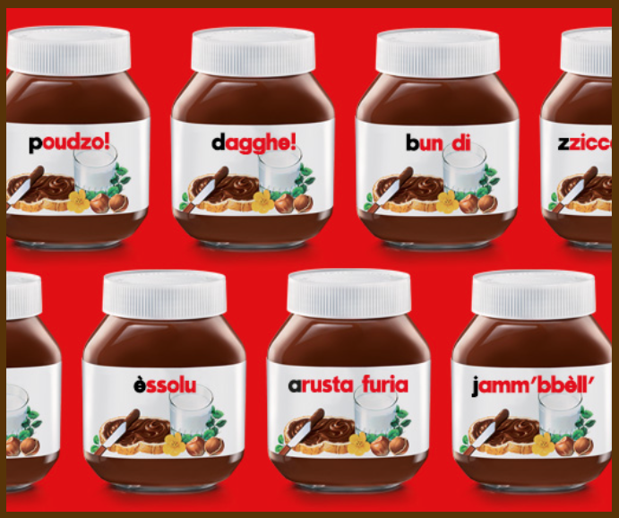 Da circa un mese la Ferrero ha lanciato, con lo slogan “Nutella parla come te”, il progetto ‘dialetti’. L’idea è di personalizzare i barattoli con 135 diverse frasi dialettali, scherzose o legate al buongiorno, scelte con l’aiuto di un team di linguisti coordinati da Francesco Avolio dell’Università degli studi dell’Aquila.