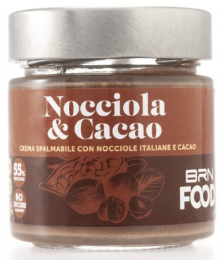 BRN Food, Crema Spalmabile Nocciola e Cacao. Ingredienti: Pasta di Nocciole* 55%, Preparato di Riso in Polvere (riso, Olio di Girasole, Sale)*, Burro di Cacao*, Inulina d’Agave in Polvere, Latte di Cocco disidratato in polvere*, Estratto di Vaniglia Bourboun, Cacao in Polvere 2,11%*. Può contenere tracce di: ANACARDI, NOCI, NOCCIOLE. * Biologico