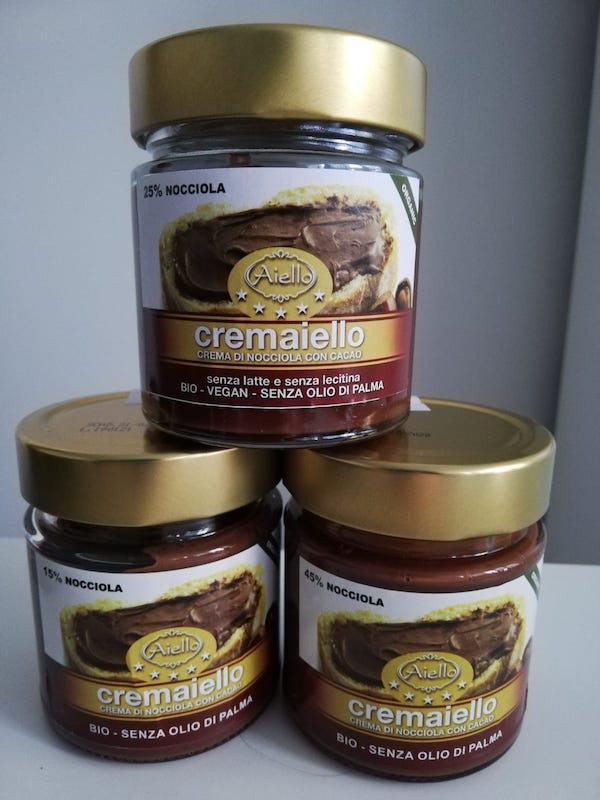 A.D. srl, Aiello, Crema di nocciola con cacao biologica, Cremaiello (con diverse percentuali di nocciola (15%, 25%, 45%)). La crema 25% è anche vegana. Ingredienti: Nocciole, zucchero di canna, cacao in polvere, latte magro in polvere, olio di semi di girasole, lecitina di girasole. Ingredienti crema vegana: Nocciole, zucchero di canna, cacao in polvere, olio di semi di girasole, burro cacao |