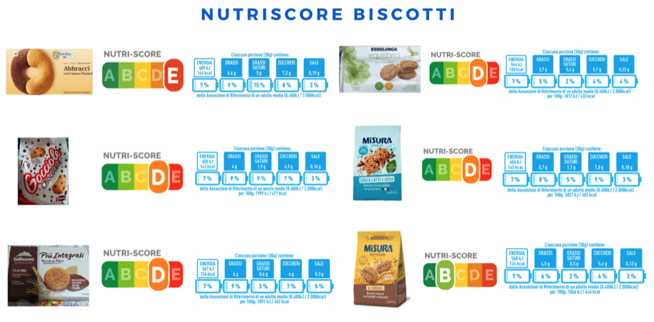 La NutrInform Battery riferita a questi sei tipi di biscotti “ti manda in tilt” perché ha troppi numeri da confrontare tra loro, e non si riesce ad avere neppure un giudizio di sintesi per la categoria biscotti. Il Nutri-Score ci permette non solo di evidenziare in modo rapido e immediato i biscotti migliori, ma consente anche di valutare i biscotti come gruppo alimentare, perché sono pochi quelli che meritano un giudizio ‘A’ o ‘B’ verde, quasi tutti meritano il colore arancione/rosso ‘D’ o ‘E’. Quindi il consumatore, grazie al Nutri-Score capisce che i biscotti sono prodotti da consumare con moderazione.