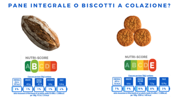 Seguendo le linee guida per una sana alimentazione si scopre che i biscotti a colazione possono essere tranquillamente sostituiti al pane tutte le volte che vogliamo. Quindi sarebbe utile capire cosa comporta utilizzare biscotti a colazione al posto del pane. La NutrInform Battery è poco utile perché, riferendosi alle porzioni indicate da ogni produttore non è possibile comparare gruppi alimentari diversi (in questo caso 50 grammi il pane e 30 i biscotti). Il Nutri-Score invece si riferisce sempre a 100 g di alimento, quindi è possibile confrontare anche prodotti che appartengono a categorie diverse come il pane e i biscotti: il pane si colloca tra ‘A’ e ‘B’ (verde) mentre i biscotti tra ‘D’ e ‘E’ (arancione e rosso).