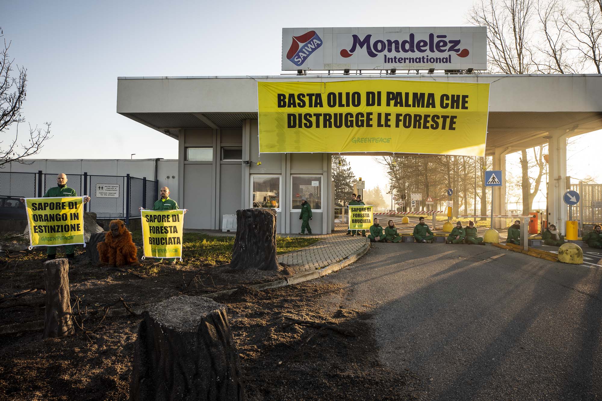“Mondelēz e le altre multinazionali devono smettere di rifornirsi da Wilmar, il principale commerciante di olio di palma a livello globale, fin quando questo non sarà in grado di dimostrare che l’olio di palma che vende non è prodotto a scapito delle foreste.” È quanto denuncia Greenpeace, che ha simulato la distruzione di una foresta pluviale davanti allo stabilimento della multinazionale Mondelēz a Capriata d’Orba, dove produce per il mercato italiano snack contenenti olio di palma come i cracker Ritz e le patatine Cipster.