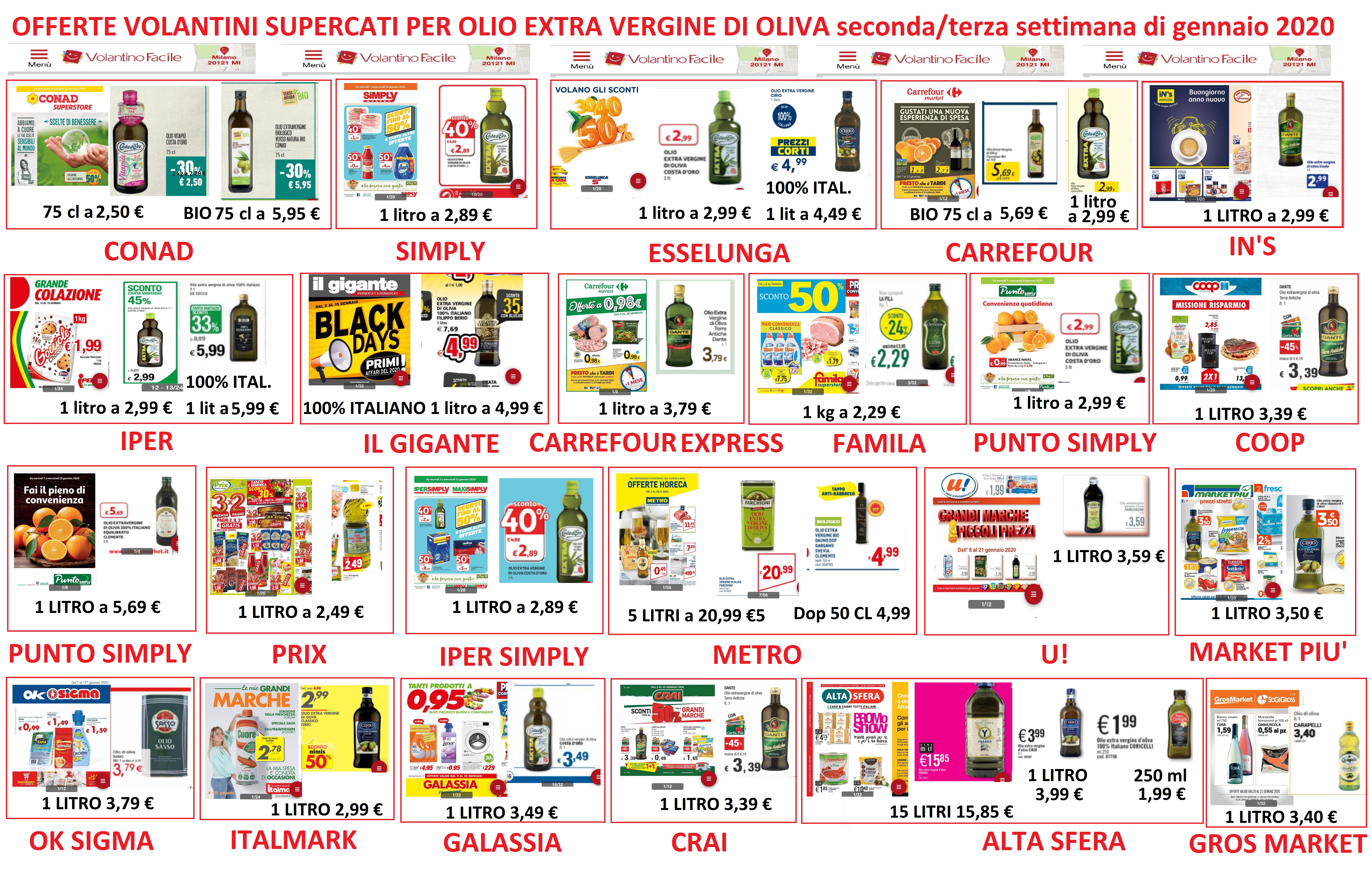 La petizione, infatti, ambisce ad essere anche uno strumento per comunicare ai cittadini le verità sulle dinamiche del settore olivicolo oleario e rendere i consumatori più consapevoli, anche attraverso la creazione di video che spiegano il valore di un olio extravergine di qualità. La questione non riguarda l’impiego “occasionale” dell’olio come prodotto civetta, ma la constatazione che questa pratica di vendita è impiegata quotidianamente da tutti i circuiti della grande distribuzione organizzata nazionale come la figura che riassume i prezzi in volantino per l’olio extravergine di oliva in Lombardia nella seconda e terza settimana di gennaio 2020.