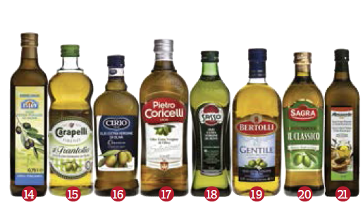 Del tutto imprevista l’ultima posizione per Almaverde bio biologico 100% italiano proposto al prezzo di 13,94 €/litro. Mentre un altro olio “bio”, Esselunga italiano, si colloca al quattordicesimo posto, al prezzo di 12,66 €/litro. Il famoso Olio Carli Delicato ricavato da olive di origine UE si attesta al 12° posto. Penalizzati nelle ultime posizioni anche: Cirio, Coricelli, Sasso, Bertolli e Sagra Classico.