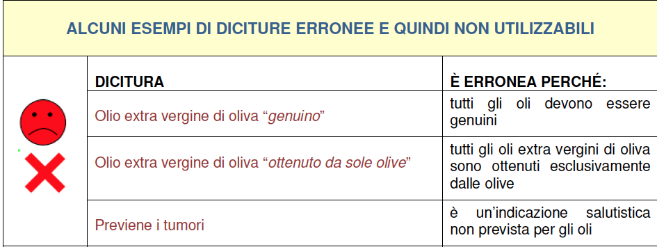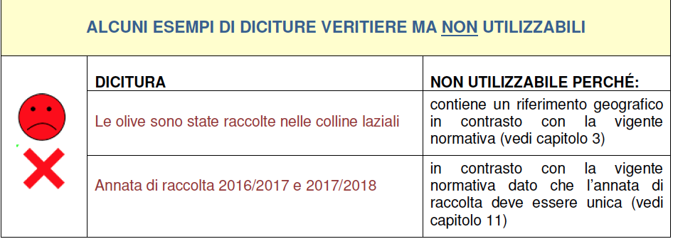 Una pagina del dossier dell’Icqrf è dedicato alle scritte vietate come “genuino” e ad altre frasi che, anche se veritiere, non sono autorizzate come ad esempio “olive raccolte nelle colline laziali”.