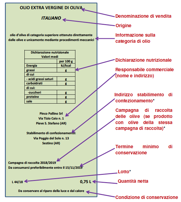 Sull’etichetta deve comparire sempre l’origine dell’olio, precisando se è ricavato da olive europee o non europee. C’è di più, il produttore deve precisare quando le olive provengono da un Paese diverso da quello del frantoio. Un’altra cosa poco nota è che, tranne nel caso delle Dop, sull’etichetta non si possono scrivere diciture riferite alla regione o alla località (olio ligure, olio toscano, olio pugliese…). La cosa strana non facile da spiegare è che su tutte le bottiglie a fianco della denominazione del prodotto “olio extravergine di oliva”, deve esserci la frase “olio d’oliva di categoria superiore ottenuto direttamente dalle olive e unicamente mediante procedimenti meccanici”.
