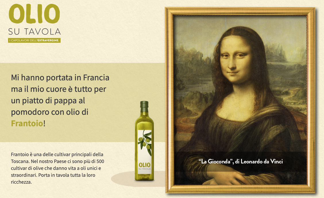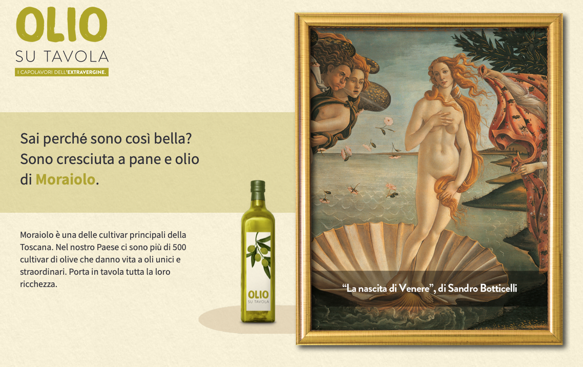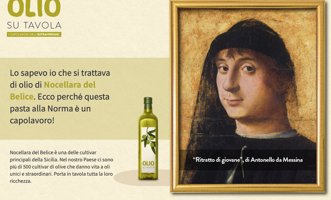 Associando i diversi extravergine ai dipinti dei più grandi geni della pittura italiana, come Leonardo, Botticelli, Tiziano e Il Perugino, si punta finalmente a promuovere un prodotto di grande valore celebrandone il rilievo anche culturale. In particolare colpisce l’ultimo spot visto in TV, lanciato proprio il 26 Novembre scorso in occasione della giornata internazionale dell’olivo e che verrà trasmesso sino a fine Dicembre sul circuito Rai, Raiplay, coinvolgendo finalmente i media nazionali con una programmazione su tv, web tv, testate giornalistiche e radiofoniche, raggiungendo così milioni di italiani.