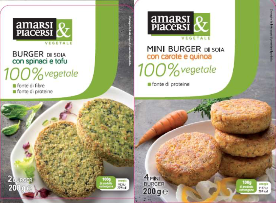 - Burger di soia con spinaci e tofu Amarsi & Piacersi, in confezioni da 200 grammi appartenenti ai lotti numero F600219 con la data di scadenza 06/08/2021, F600310 con scadenza 11/08/2021, F600391 con scadenza 18/08/2021 e F600542 con scadenza 27/08/2021