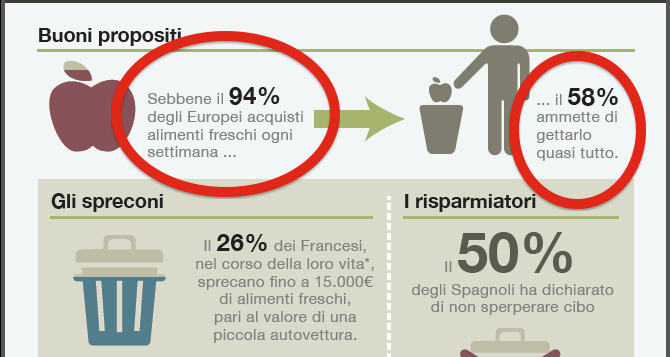 Sfogliando il comunicato stampa si scopre già un primo aggiustamento, laddove si legge che “Il 58% degli europei getta cibo fresco ogni settimana” senza specificare la quantità. Anche il testo che accompagna dice una cosa leggermente diversa “Oltre la metà (il 58%) degli europei non riesce a consumare il cibo fresco che acquista ogni settimana, gettandolo invece nella spazzatura. Questo spreco si afferma nonostante il 94 % degli intervistati acquisti regolarmente ingredienti freschi per preparare i pasti”.