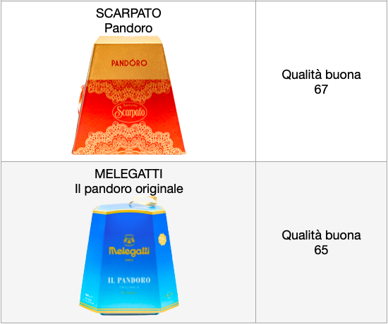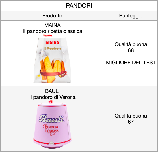 Sette pandori su otto hanno ottenuto un giudizio di qualità globale buono, e soltanto uno di qualità media. Al primo posto troviamo il pandoro ricetta classica Maina, che si aggiudica quindi il titolo di Migliore del Test. In seconda posizione si trovano due dolci che hanno lo stesso punteggio, quelli a marchio Scarpato e Bauli. Al terzo posto il pandoro originale Melegatti. In fondo alla classifica, con un giudizio di qualità medio, si posiziona il pandoro di Verona ricetta classica a marchio Paluani.