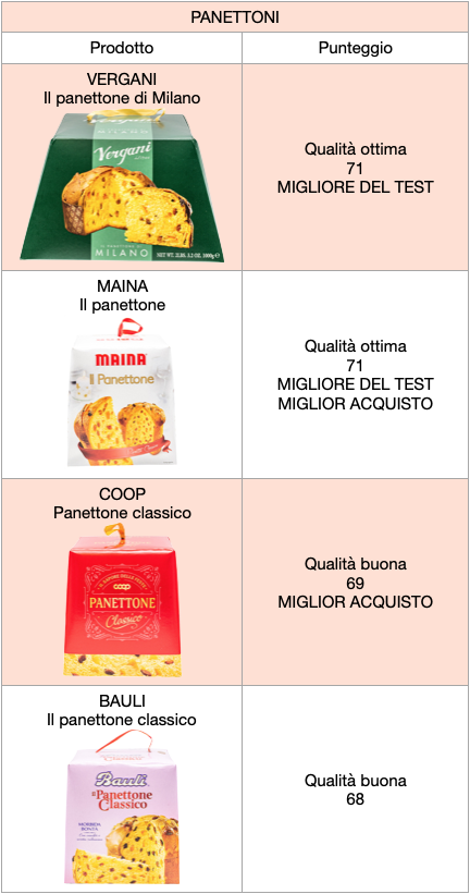 Titolo condiviso con il secondo classificato, il panettone classico a marchio Coop venduto in media a 5,15 €, che è stato giudicato in generale di buona qualità. Chiude il podio il panettone classico Bauli (5,75 €), anch’esso considerato di buona qualità. Rispetto ai primi due, questi prodotti sono stati leggermente penalizzati alla prova di assaggio degli esperti. In generale, anche tutti gli altri dolci testati sono risultati di buona qualità, solo due hanno ricevuto un giudizio medio.