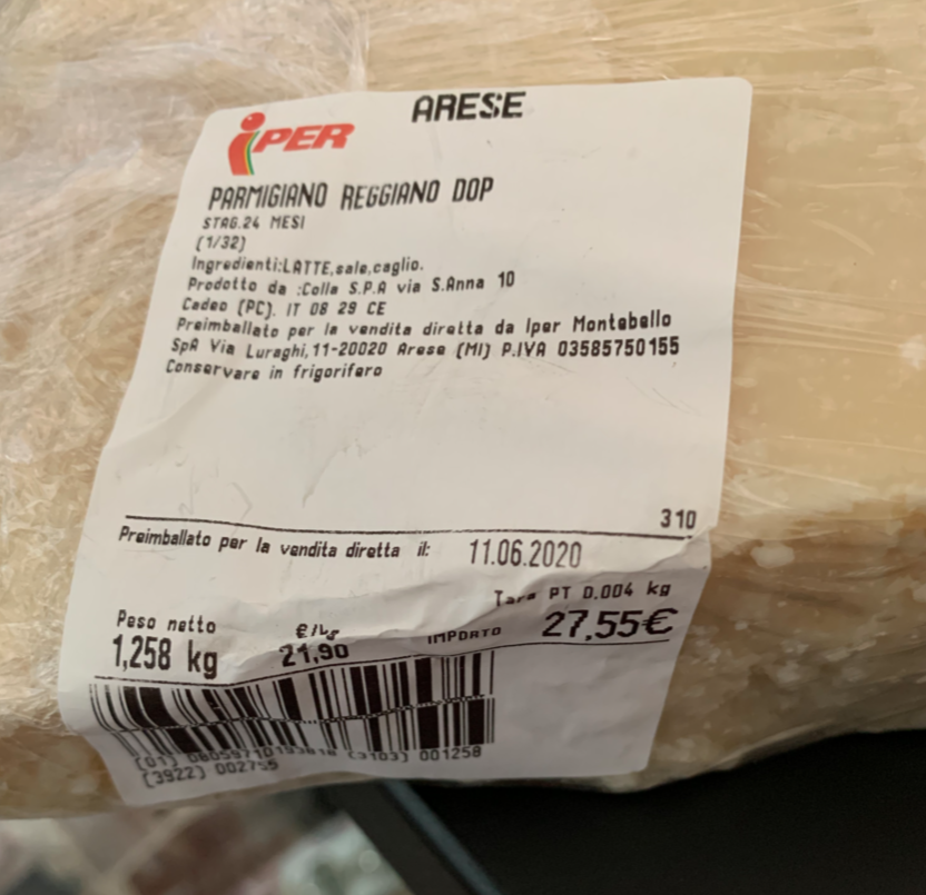 Buongiorno, scrivo in relazione all’acquisto di un pezzo di Parmigiano Reggiano presso il punto vendita Iper di Arese (MI) ho trovato in etichetta che il medesimo era stato prodotto dal caseificio “Colla S.p.A” sito a Cadeo (PC) via Sant’Anna 10 come si vede dalla foto. Ora, se non sbaglio l’areale di produzione del Parmigiano Reggiano come cita il sito web del consorzio omonimo è il seguente: