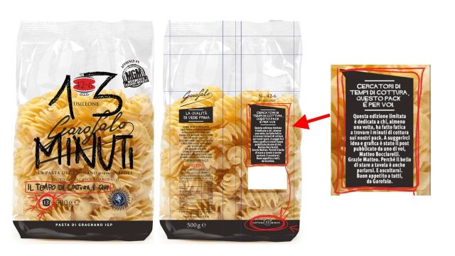 Il tempo di cottura della pasta è quasi sempre indicato con caratteri tipografici piccoli posizionati nelle aree meno visibili della confezione. Qualche mese fa è addirittura nato un “Movimento Grandi Minuti”, divertente campagna social che invita le marche di pasta a rendere più visibile questa informazione. Garofalo ha risposto all’iniziativa scherzosa con un nuovo pack, in edizione limitata, dove l’indicazione dei minuti viene indicata con grande rilievo sul frontespizio. Esaurita l’edizione limitata è stato deciso di estendere l’iniziativa progressivamente a tutti i formati cominciando con spaghetti e penne rigate, dove compare una scritta in caratteri ben evidenti che recita “Il tempo di cottura è qui”, affiancata da una freccia con i minuti necessari.