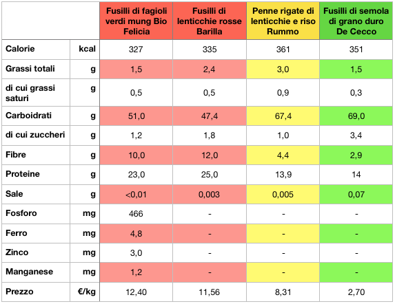 Abbiamo preso – abbastanza a caso – alcuni prodotti presenti sul mercato e le relative tabelle nutrizionali: come abbiamo detto, da un punto di vista nutrizionale, le paste di legumi rispetto a quelle di semola di grano duro hanno un apporto più elevato di proteine e fibre.