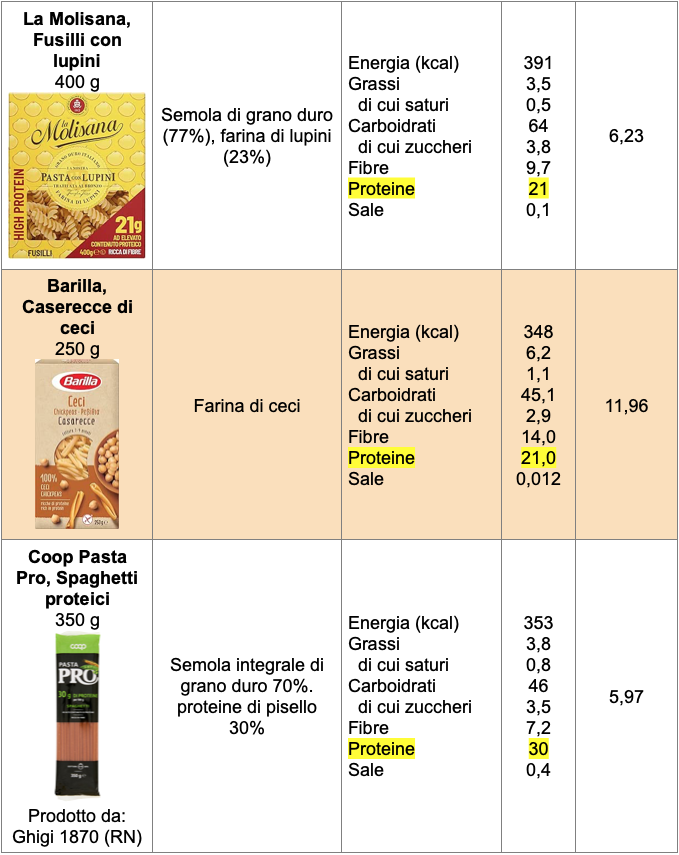 La pasta Felicia, quella di Conad (prodotta, come il marchio Felicia, dall’azienda pugliese Andriani) e l’analoga Barilla, sono realizzate esclusivamente con farina di legumi: lenticchie, piselli o ceci. La pasta De Cecco è a base di semola di grano duro arricchita con farina di lenticchie, farina di fave, glutine di frumento e farina di piselli. La Molisana è a base di semola di grano e farina di lupini, quella a marchio Sgambaro è fatta con sfarinato di farro, farina di lenticchie, farina di quinoa e proteine isolate di piselli. La pasta proteica Coop e la pasta Dalla Costa, venduta nei punti vendita Aldi, vedono come ingredienti semola di grano duro (integrale nel prodotto Coop) e proteine di piselli.