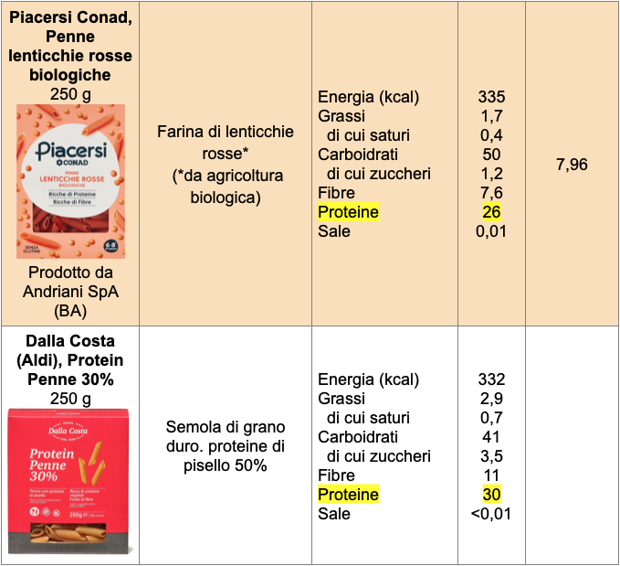 La quota proteica dei prodotti a marchio Sgambaro, La Molisana e Barilla arriva al 20% circa, mentre le paste Felicia e quelle a marchio Conad hanno un contenuto proteico pari al 20-26% a seconda dei legumi utilizzati. La pasta Coop e quella venduta all’Aldi, arricchite con proteine isolate di piselli, arrivano al 30%, così come il prodotto De Cecco, ‘potenziato’ con glutine di grano.
