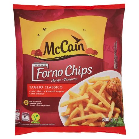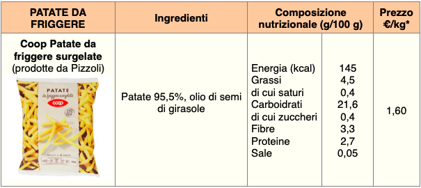 L’apporto energetico per 100 grammi va da 124 a 180 kcal; il contenuto di grassi delle patatine da friggere rimane intorno al 4%, come anche quello della maggior parte dei prodotti da far rinvenire in forno, tranne alcuni casi in cui si arriva al 6%. Fanno eccezione le chips Come una volta (prodotte da Gias): senza aggiunta di grassi, forniscono solo 100 kcal per 100 grammi. Il sale di solito è presente in quantità ridotta, intorno allo 0,1% ; nelle patatine McCain e in quelle a marchio Come una volta si sale invece a 0,5 e 0,7%, un aspetto cui bisogna fare attenzione se dopo la cottura vogliamo aggiungere ulteriore sale.