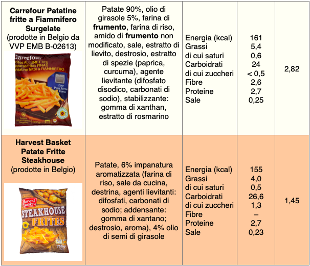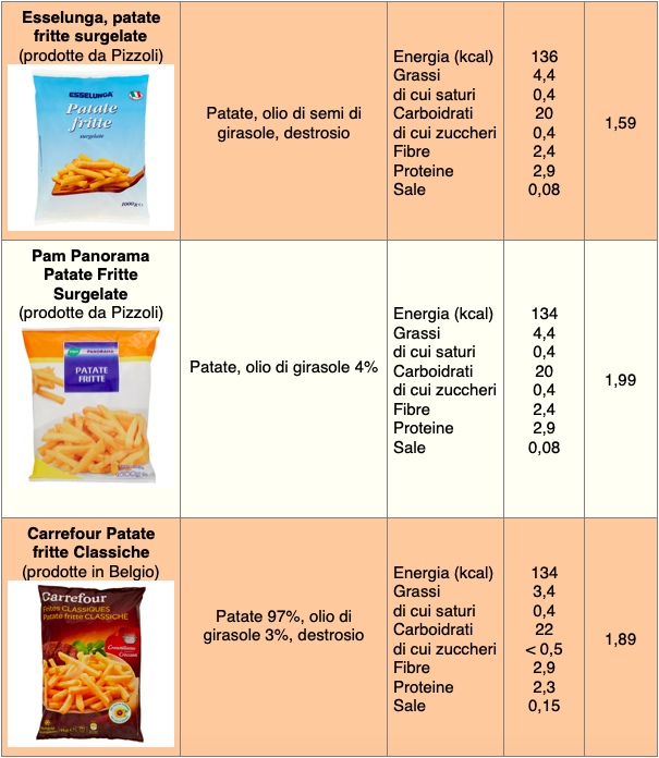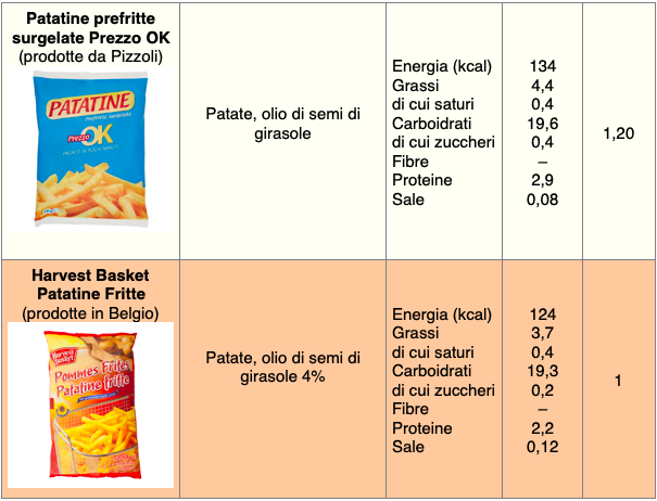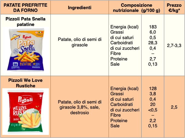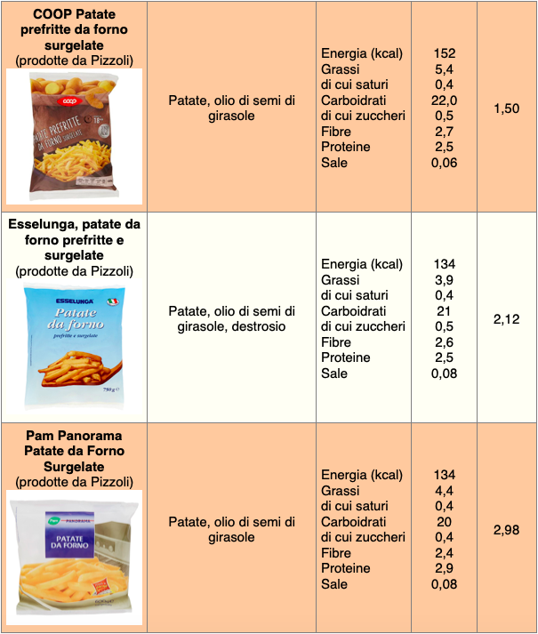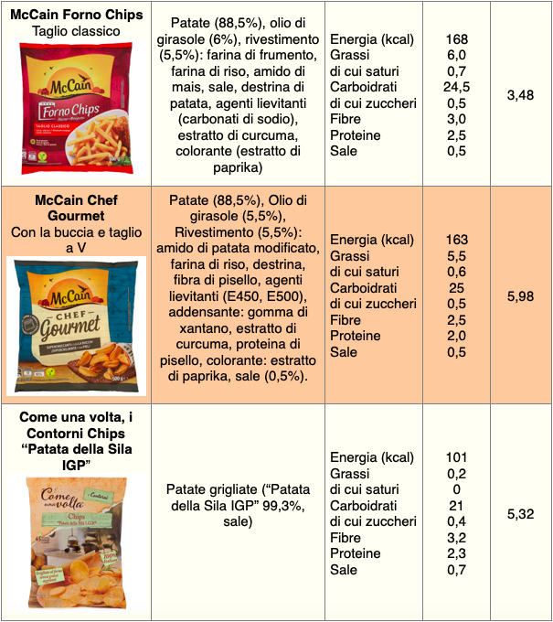 Per quanto riguarda i prezzi (considerando i siti delle principali catene su città del nord), le patate da far rinvenire in forno a marchio Harvest Basket costano circa 1,45 €/kg, le Coop 1,60, quelle a marchio Esselunga circa 2, i prodotti Pam e Carrefour poco meno di 3. Le patatine Pizzoli costano circa 2,5-3 €/kg, le chips fatte con patate Igp della Sila superano i 5 e le McCain Chef Gourmet arrivano a 6 €/kg. Le patate da friggere costano mediamente meno: si parte da circa 1 €/kg per le patatine del Lidl, 1,20 per la linea Prezzo Ok di Pizzoli, 1,60 quelle a marchio Esselunga e Coop, 1,90 per i prodotti Pam e Carrefour.