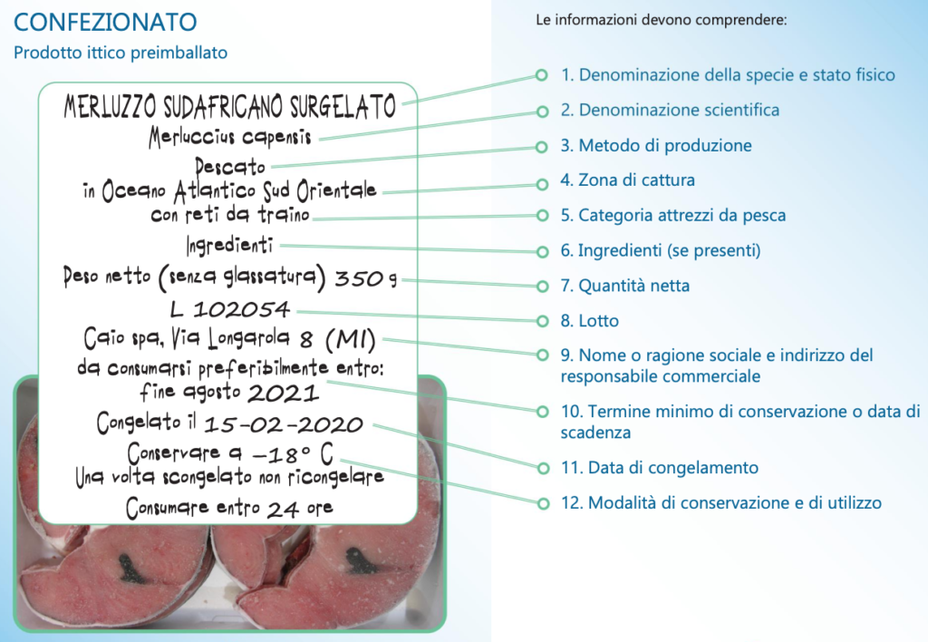 Il servizio sanitario dell’Emilia-Romagna ha realizzato un opuscolo sui prodotti ittici per aiutare le persone a capire quali sono le informazioni obbligatorie da riportare sulle etichette e sui menù dei ristoranti e per comprenderne appieno il significato (nell’opuscolo non sono descritte le preparazioni a base di pesce e le conserve). Le informazioni obbligatorie richieste in generale sono inferiori nel caso in cui i prodotti siano venduti sfusi per la distribuzione immediata alla clientela (pescherie) mentre per il pescato venduto confezionato (preimballato) sono previste etichette più dettagliate. Anche sui menù dei ristoranti sono obbligatorie una serie di informazioni come ad esempio la specifica quando il pesce è scongelato o surgelato oltre all’elenco di eventuali allergeni.