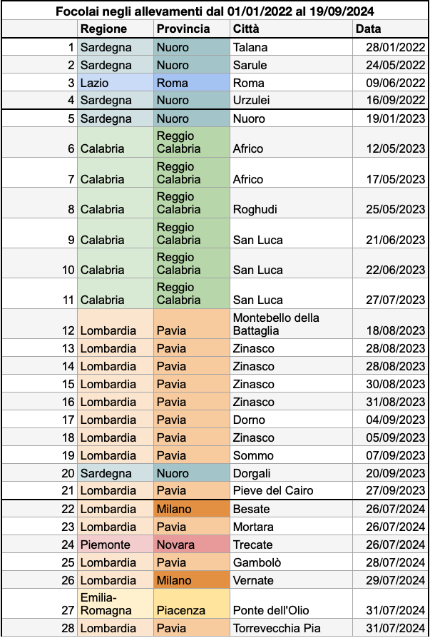 Qui sotto la tabella aggiornata al 19 settembre sulla situazione negli allevamenti dall’inizio dell’epidemia nel gennaio 2022, elaborata in base a dati ufficiali.