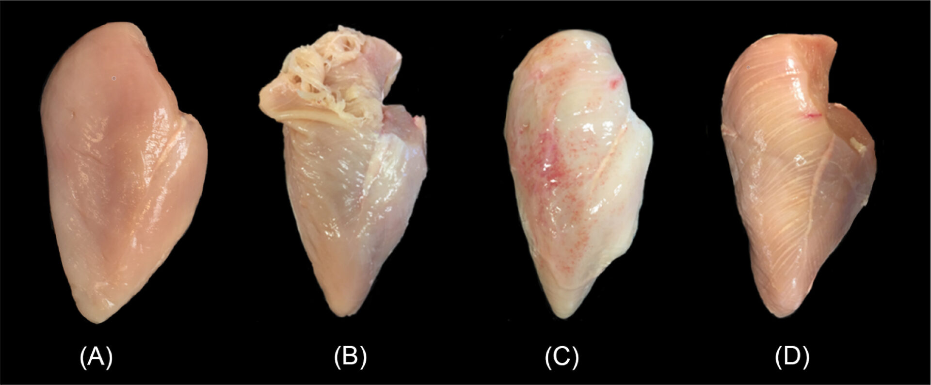 Il problema più diffuso dei petti di pollo in vendita al supermercato riguarda le strisce bianche (white striping) ben visibili a occhio nudo. Si tratta di una miopatia legata alla crescita rapida che si manifesta con un’anomala infiltrazione di grasso e tessuto connettivo fra le fibre muscolari. Secondo uno studio condotto in Italia, oltre il 50% dei petti di pollo in commercio presenta questa patologia. Ne deriva un prodotto meno proteico, più calorico e con una consistenza alterata.