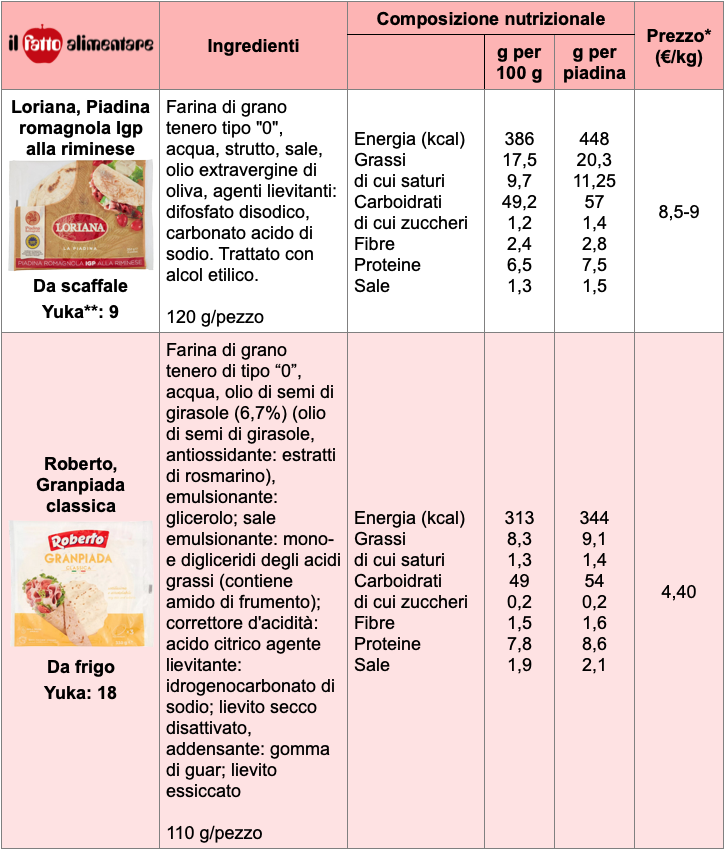 Il contenuto di grassi varia da circa 8 a 14 g/100g, però ci sono delle differenze: una piadina condita con lo strutto contiene nella maggior parte dei casi 4-6 g di grassi saturi – nella piada Loriana però si superano gli 11 g – mentre quelle con olio si fermano a 1,5-2 g. Una piadina contiene poi 1,5-2 g di sale, ma in alcuni casi si superano i 2 g al pezzo e la piadina Igp Certossa arriva a 2,6. In tabella possiamo confrontare la composizione nutrizionale per 100 g di prodotto.