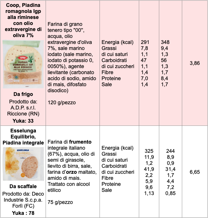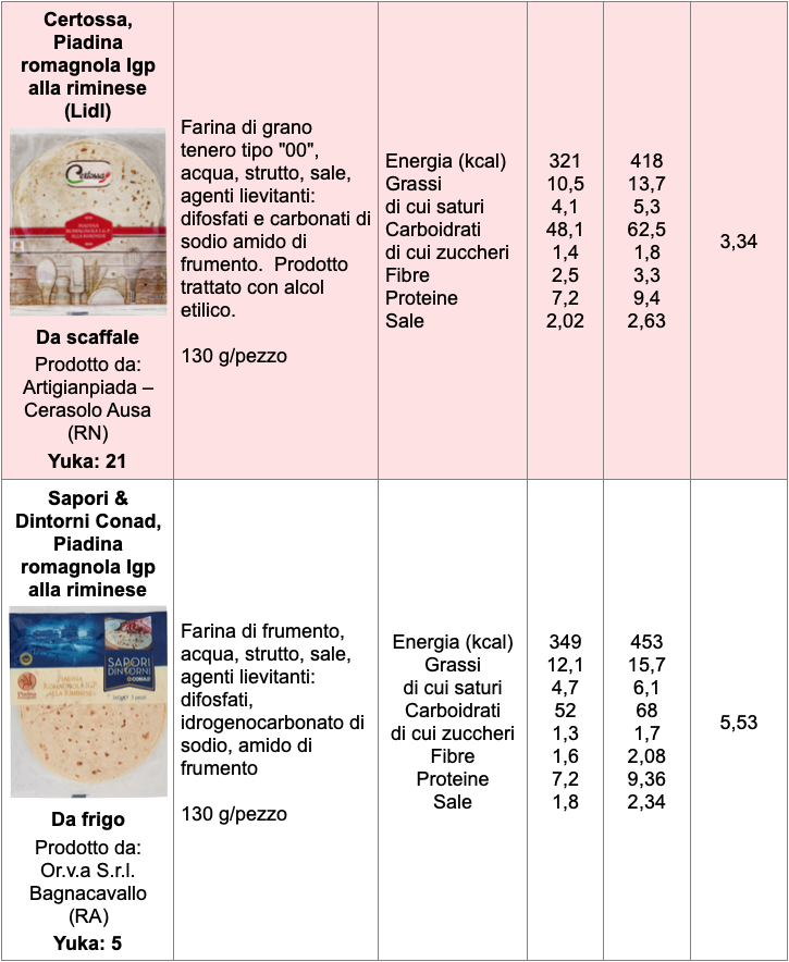 Per un Romagnolo sono un elemento costante ed indispensabile nell’alimentazione.nQuando non acquisto nei vari chioschi ma al supermercato, vada alla Lidl dove nel prodotto a scaffale c’è un rapporto qualità/prezzo molto buono ed è prodotta praticamente a km 0 (come si evince dalla vostra tabella) essendo io di Rimini. L’unica osservazione: nessun Romagnolo la chiama “piadina” bensì “piada”.