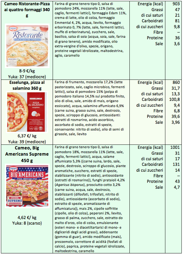 Siccome di solito chi mangia la pizza difficilmente ne mangia solo una parte, abbiamo considerato una porzione pari a una pizza, e non 100 g di prodotto, come si fa di solito. Il peso delle pizze prese in esame va da 325 a 450 g, e l’apporto energetico complessivo varia da 790 a 1.000 kcal, in relazione soprattutto al tipo di condimento e alle dimensioni. I grassi variano da 21 g nella pizza alle verdure Carrefour Bio a quasi 50 g in quella Cameo ai quattro formaggi. I grassi saturi, in particolare, variano da 7,8 g nella pizza alle verdure a 21 g in quella ai quattro formaggi: in generale la quantità dipende dall’aggiunta di mozzarella e altri formaggi, ed è più scarsa nella pizza alle verdure perché questa contiene meno mozzarella. Le proteine, fra 30 e 40 g, sono sempre in buona quantità. Il sale rimane fra 3,6 g e 4,7 g: sempre troppo se pensiamo che l’Oms raccomanda di non superare i 5 g al giorno. Fra l’altro pare piuttosto incomprensibile che il valore più basso sia quello della pizza ai quattro formaggi. Le varianti più ricche inoltre contengono diversi additivi, che vanno dai nitriti, comuni ingredienti dei salumi, agli emulsionanti e agli stabilizzanti presenti in alcuni casi.