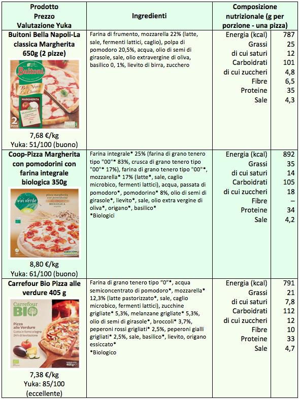 L’app Yuka, che valuta gli alimenti tenendo conto sia delle caratteristiche nutrizionali che degli additivi, fornisce giudizi che vanno da scarso, per la pizza Big Americans, penalizzata dall’eccesso di calorie, di sale e dalla presenza di diversi additivi, a eccellente per la pizza Carrefour alle verdure. Giudizio “mediocre” per la pizza ai quattro formaggi e quella al salamino, “buono” per la Margherita e quella con i pomodorini. Bisogna tenere presente che i “giudizi” di questo tipo aiutano a cogliere la differenza fra un prodotto e l’altro, ma vanno sempre visti con senso critico. Ricordiamo che si basano su 100 g di prodotto, e non sulla pizza intera, però per valutare l’impatto nutrizionale è importante tenere conto della quantità che consumiamo.