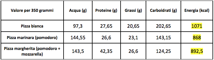 Sul sito dell’Istituto superiore di sanità si trova una tabella che riporta le caratteristiche nutrizionali di alcune pizze (di pizzeria), considerando quella “bianca”, la marinara e la Margherita.