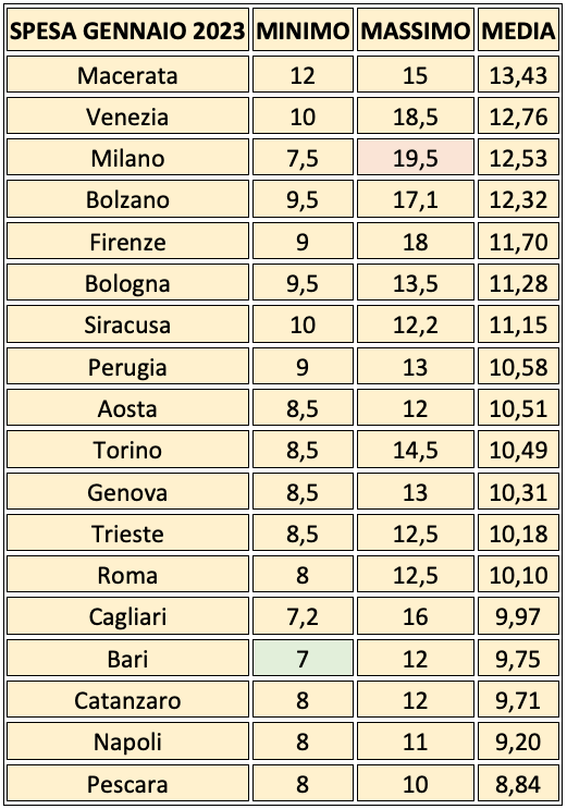Con l’aiuto della tabella si riesce a confrontare il costo medio del pasto negli ultimi 3 anni. Con le sole eccezioni di Bari e Perugia, dove la spesa è scesa, in tutte le altre città è salita, in particolare a Napoli, Macerata e Bolzano l’aumento è stato più sensibile.