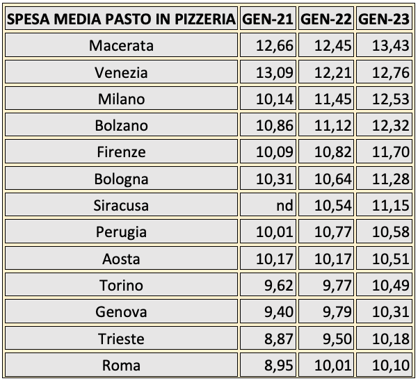 La città più costosa è Macerata, con un costo medio per pizza, bevanda, coperto e servizio di 13,43 euro, mentre la più economica è Pescara con un costo medio di 8,84 euro e dove soprattutto non non si superano i 10 euro. Altroconsumo precisa che si tratta di una media, perché ci sono città, soprattutto al Nord o quelle più a vocazione turistica (come Venezia e Firenze), in cui si arrivano a spendere anche 20 euro. In alcune località si registra invece una grande differenza tra la spesa minima e quella massima, come ad esempio a Milano (da 7,50 a 19,50 euro), seguita da Firenze (da 9 a 18), Cagliari (da 7,20 a 16) e Venezia (da 10 a 18,50 euro).