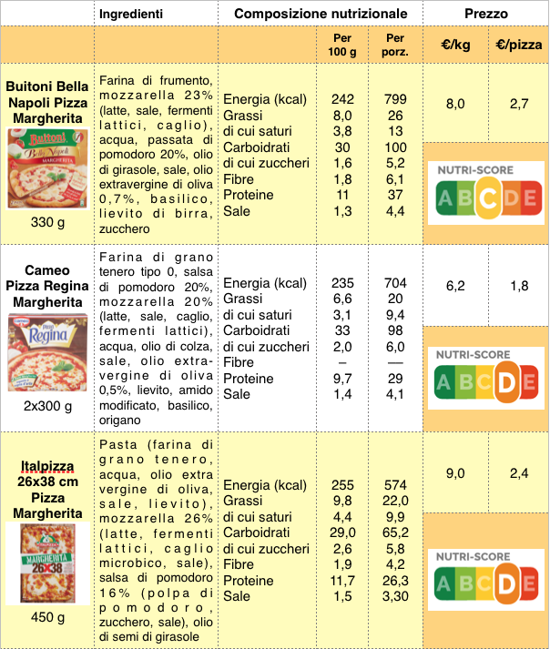 Come al solito, la lettura attenta delle etichette ci aiuta fare scelte ragionate: l’elenco degli ingredienti delle pizze che abbiamo considerato è abbastanza simile per tutte le pizze, e la lavorazione in alcuni casi è molto accurata; il peso e la composizione nutrizionale di una porzione, d’altra parte, variano notevolmente da un tipo all’altro.