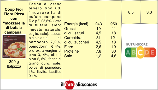 Se applichiamo la valutazione Nutri-Score (sistema francese che prevede da A-bollino verde, per i prodotti più equilibrati, a E-bollino rosso per quelli sbilanciati, da consumare con moderazione) la maggior parte di queste pizze riceve un punteggio intermedio C, grazie al fatto che la quantità di grassi, proteine e carboidrati risulta discretamente bilanciata.