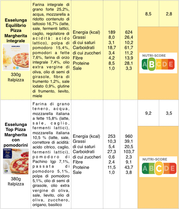 Come abbiamo già detto, però, quello che conta è la dimensione delle porzioni, perché le fra le 570 kcal della più leggera e le 950 delle pizze premium, in una dieta da 2.000 kcal, c’è una notevole differenza, soprattutto se la pizza è accompagnata da una bevanda dolce o alcolica, e magari seguita da un dessert. Ricevono una valutazione D, più penalizzante, la Margherita Coop, e quella Italpizza, un po’ più ricche di grassi saturi, e la Cameo, probabilmente perché la tabella nutrizionale non riporta la quantità di fibre, nutriente che il sistema Nutri-Score valuta in modo positivo. Ricevono una B, valutazione migliore della media, le pizze Esselunga, sia la Margherita tradizionale che quella integrale, premiate per il contenuto in grassi e sale inferiore alla media.
