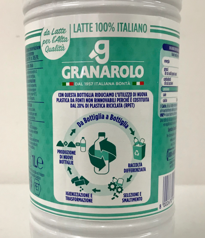 Le prime bottiglie di latte marchiate Granarolo con il 20% di plastica riciclata arriveranno sul mercato nel marzo 2019, grazie all’impiego di Pet riciclato (r-Pet) proveniente dalla raccolta differenziata. La quantità di r-Pet nelle bottiglie arriverà al 25% a partire dalla seconda metà dell’anno, come prevedono le direttive europee per ogni bottiglia in Pet immessa sul mercato dell’Unione a partire dal 2025. Granarolo prevede anche di ridurre la plastica delle bottiglie, delle vaschette e dei film, e la sostituzione degli imballaggi multimateriali con alternative riciclabili.