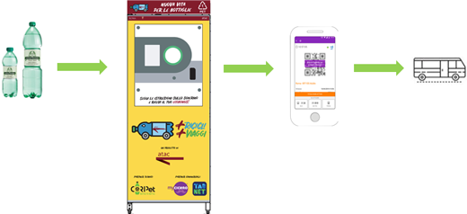 Il 23 luglio nella capitale è stata presentata +Ricicli +Viaggi, la campagna Atac (Azienda per i Trasporti Autoferrotranviari del Comune) per favorire la raccolta e il riciclo delle bottiglie in PET. L’iniziativa, in via sperimentale per un anno, premia i viaggiatori che conferiscono le bottiglie vuote facendoli viaggiare gratis. Il tutto si basa su un sistema tecnico che comprende macchine speciali per la raccolta, gli ecocompattatori, e due app. In pratica con 30 bottiglie riciclate si ha un biglietto per corsa singola, che a Roma costa 1,50 €.