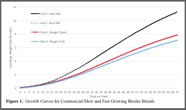 Gli studiosi statunitensi hanno confrontato i dati riferiti a circa 18 anni di attività negli allevamenti, forniti dalle aziende su due razze di polli a crescita lenta (Ranger Classic e Ranger Gold) e due a crescita rapida (Ross 208 e Cobb 500). I primi impiegano rispettivamente 54 giorni e 59 giorni per raggiungere il peso di 2,7 kg, mentre le razze a crescita più rapida arrivano al peso target in circa 41 giorni. Questi dati sulla crescita sono quindi stati combinati con quelli relativi ai costi di mangime e di gestione degli spazi negli allevamenti, considerando anche la densità degli animali per metro quadrato. Secondo lo studio le razze a crescita rapida sono molto più redditizie e generano circa il doppio del guadagno rispetto a quelli a crescita più lenta. Per ottenere lo stesso volume di carne da broiler a crescita lenta, sarebbe necessario avere una maggiore metratura all’interno dei capannoni e i costi di produzione sono quindi più elevati.