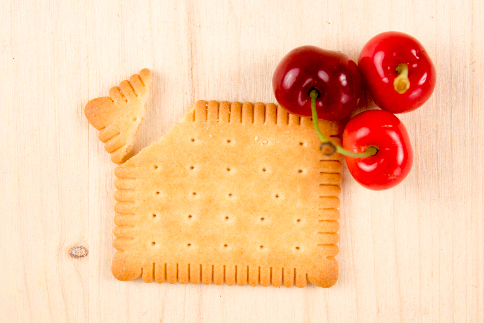 Rosso ciliegie su uno sfondo di legno con biscotto al burro petit zuccheri frutta sgrammatura