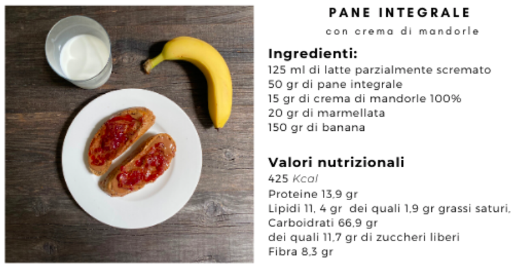 1. Pane integrale con crema di mandorle al 100% e marmellata, una banana e un bicchiere di latte