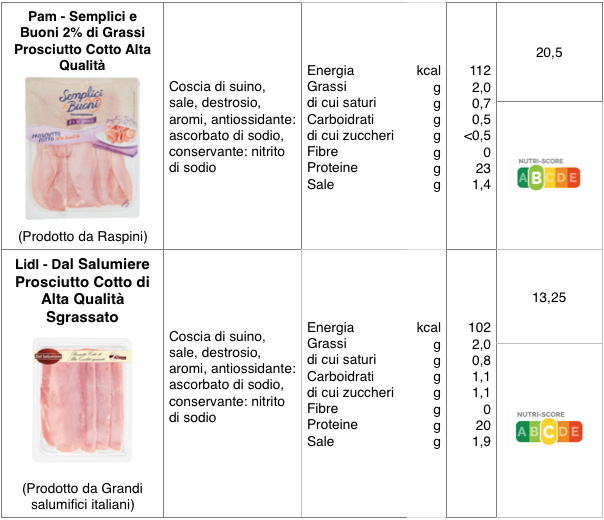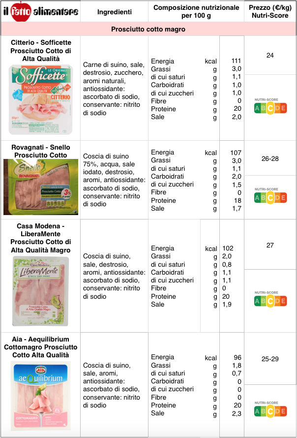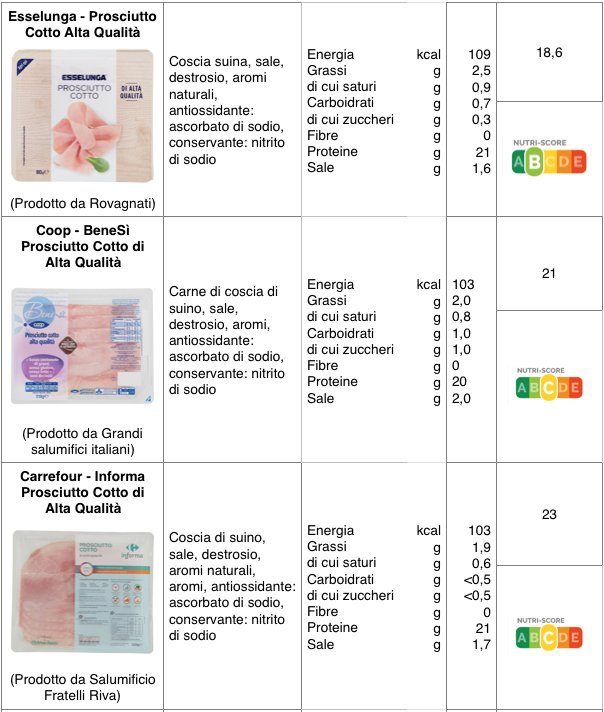 Per quanto riguarda l’aspetto nutrizionale, i prosciutti esaminati sono molto simili. Il contenuto calorico varia da 96 a 112 kcal per 100 g, i grassi oscillano dall’ 1,8 al 3% g e il contenuto di proteine, rimane intorno a 20 grammi. La quantità di sale varia da 1,4 a 2,3 per 100. La maggior parte di questi prodotti, se valutati con il sistema francese Nutri-Score (*), riceve il giudizio medio C, tranne i salumi a marchio Esselunga e Pam, che, grazie al contenuto di sale più basso, sono premiati con una B.