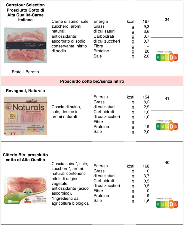 È un’innovazione molto interessante perché i nitriti sono additivi potenzialmente pericolosi, utilizzati come conservanti e normati in modo molto rigoroso; sarebbe interessante capire se i nitriti introdotti con l’utilizzo di erbe vengano in qualche modo misurati, e se è possibile che siano in eccesso. Questo prosciutto costa circa 41 €/kg. Sono ugualmente cari i salumi ottenuti da suini allevati secondo il disciplinare biologico: 40 €/kg per il cotto bio di alta qualità Citterio (con nitriti di origine vegetale), 52 € per quello a marchio Carrefour (prodotto da Beretta), 35 € quello a marchio Pam (prodotto da Raspini).