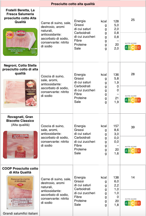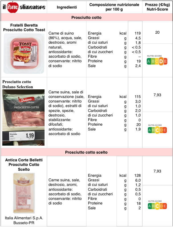 Il Fatto Alimentare ha preso in esame alcuni marchi famosi di prosciutto cotto (Beretta, Citterio, Antica Corte Belletti, Rovagnati, Negroni) e altri con il marchio del supermercato come: Coop, Esselunga, Carrefour e Lidl, senza considerare i prodotti a basso contenuto di grassi, cui sarà dedicato un altro articolo.