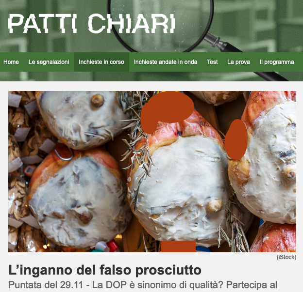 Ancora non visibile sul sito RSI https://www.rsi.ch/la1/programmi/informazione/patti-chiari/Inchieste/inchieste-andate-in-onda/L’inganno-del-falso-prosciutto-12305178.html