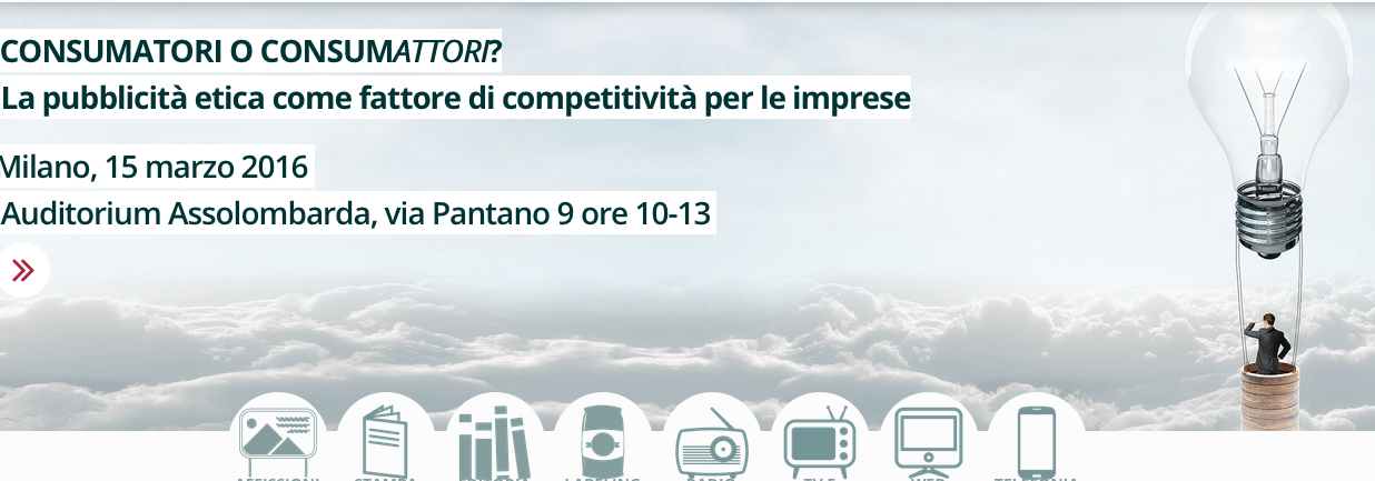 Il 15 marzo si terrà a Milano (ore 10.00-13.00) presso l’Auditorium Assolombarda (Via Pantano 9) l’incontro “Consumatori o consumattori? La pubblicità etica come fattore di competitività per le imprese”, promosso da EthicsGo, istituto indipendente di comunicazione etica.