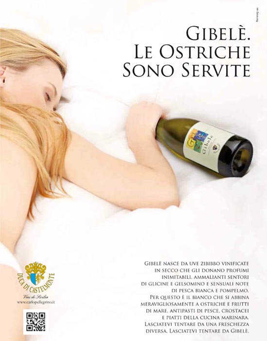 Pubblicità vino: il Comitato di controllo dell’Istituto di autodisciplina pubblicitaria ha censurato il messaggio dello zibibbo Gibelè delle Cantine Pellegrino, perchè non rispetta la dignità della persona e viene meno alle regole sui messaggi relativi agli alcolici. Il messaggio (vedi a lato) mostra l’immagine di una donna prona su un letto, verosimilmente senza vestiti, con in mano una bottiglia vuota del vino pubblicizzato. Si tratta di una foto che vuole attirare l’attenzione del pubblico, attraverso una rappresentazione svilente della persona. In questo caso non è il tema della sessualità in sé ad essere messo in discussione, ma la rappresentazione della donna ridotta a corpo abbandonato, vuoto come la bottiglia.