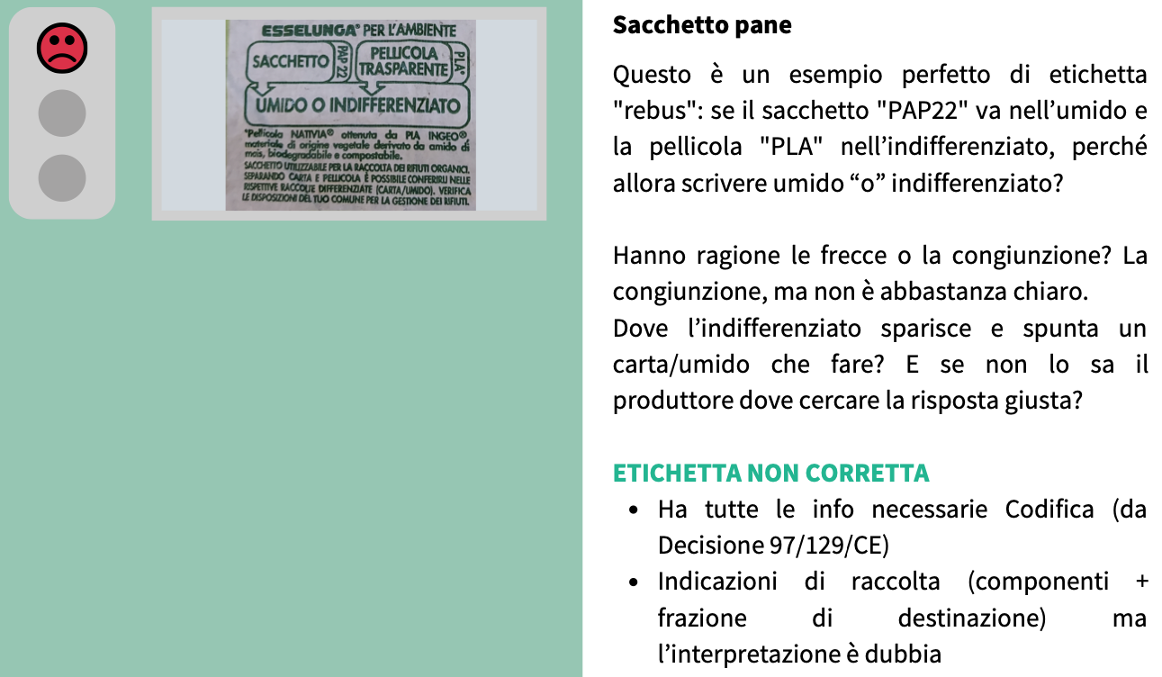 Tra i casi più eclatanti, troviamo ad esempio un sacchetto salvafreschezza per prodotti sfusi su cui sono sbagliati sia il codice del materiale che la frazione in cui va conferito. In un altro caso, un sacchetto del pane di carta con finestrella in PLA presenta un’indicazione di smaltimento a dir poco confusa: “umido o indifferenziato”, con una freccia che parte dalla sacchetto e punta su umido, e una che dalla pellicola va all’indifferenziato. Le due parti vanno separate? Si può buttare tutto insieme in un bidone o nell’altro? Difficile dire quale sia l’interpretazione corretta, come si può vedere nello schema qui sotto. In molti casi poi i produttori cadono sullo smaltimento della carta da forno, che va conferita nell’indifferenziato ma che spesso riporta l’indicazione errata “carta”.