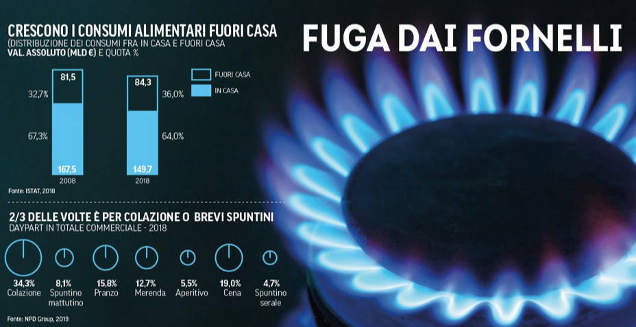 Tra gli impegni lavorativi e i momenti liberi da gestire, si dedica sempre meno tempo alla cucina, dimezzato vent’anni (oramai appena 37 minuti al giorno trascorsi a cucinare), mentre aumenta la spesa per la ristorazione extradomestica soprattutto per colazione o brevi spuntini.